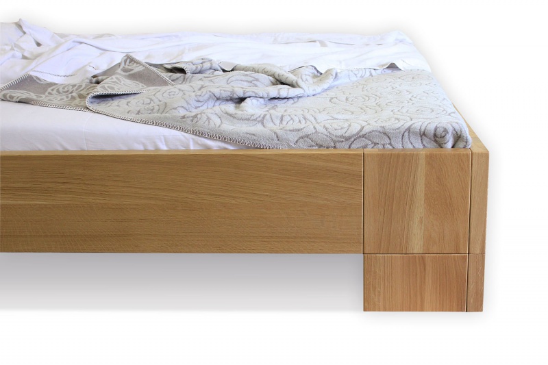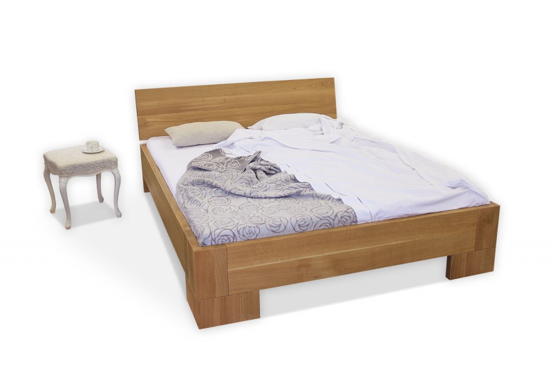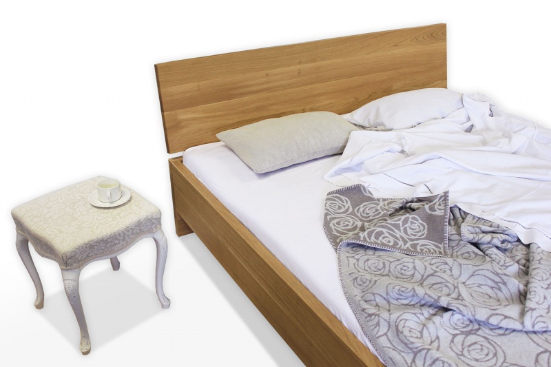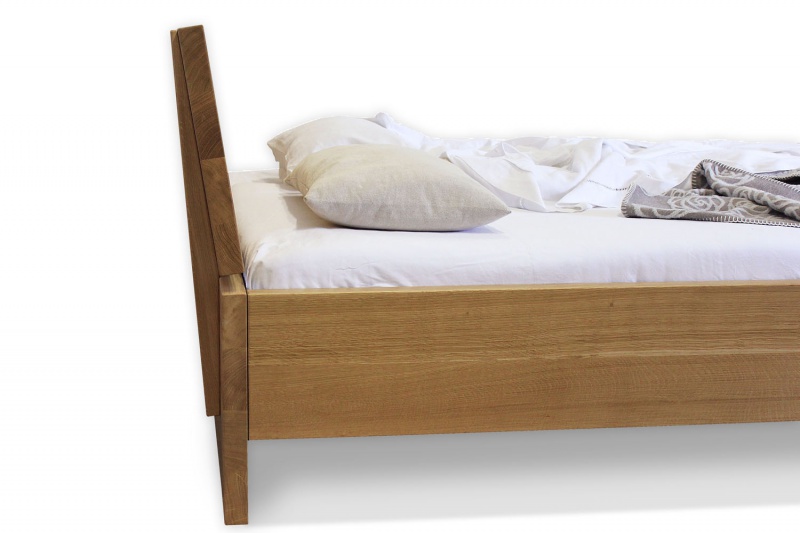 Postelja na sliki je izdelana iz masivnega hrastovega lesa ter lakirana. Postelja ima nagnjen naslon. Za ta tip postelje priporočamo nakup vzmetnice debeline 15-25 cm. Poljubno je lahko tudi višja ali nižja ter tudi brez naslona.