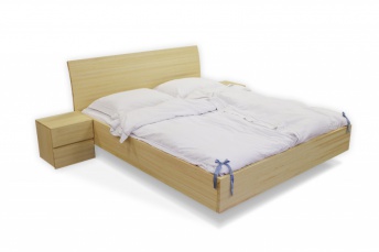 Ta model postelje daje občutek lebdenja. Postelja na sliki je izdelana iz masivnega jesenovega lesa ter lakirana. Naslon postelje je za ukrivljen. Za ta tip postelje priporočamo nakup vzmetnice debeline 15-25 cm. Poljubno je lahko tudi višja ali nižja ter tudi brez naslona.